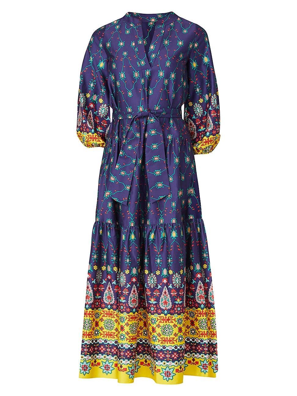 - Stroll through the garden in this beautiful dress! - Unlined material with an abstract floral print featuring green, blue, and orange hues - A collared v-cut neckline - Short sleeves with rolled cuffs - A wrap style cut - Hidden tie closure inside as well as side tie closure - A relaxed yet flattering silhouette that ends in a midi length hemline with a side slit accent