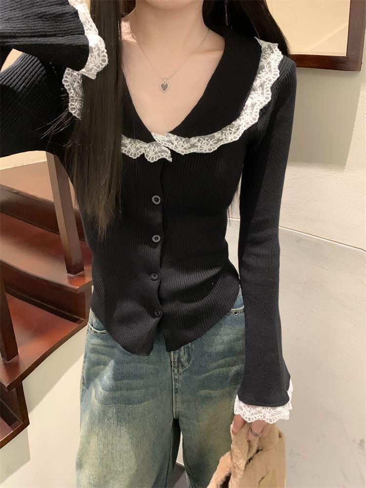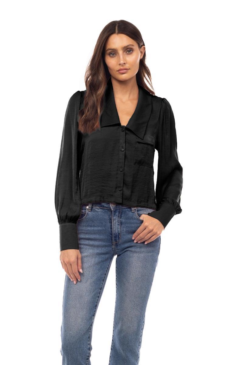 Soft cotton voile top. Peter Pan collar with scalloped lace trim. Elbow puff sleeves with scalloped lace trim. Button front. Lace insert detailing at front and back. #777298