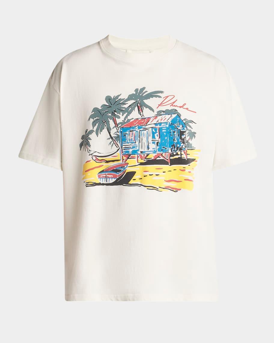 Rhude T-shirt featuring beachside print on front Crew neckline Short sleeves Relaxed fit Pullover style Cotton Made in USA