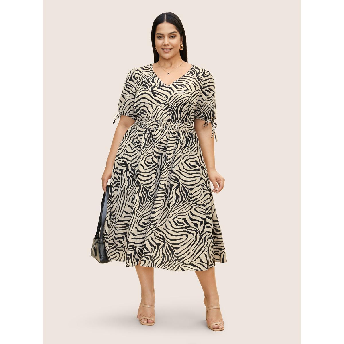 Plus Size Leopard Overlap Collar Elastic Waist Belted Dress Black Women At the Office Non Overlap Collar Elbow-length sleeve Curvy Midi Dress BloomChic 14-16/1X