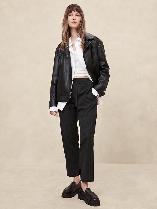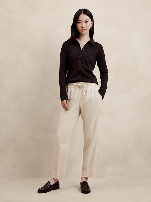 SUSTAINABILITY: Made with 63% recycled polyester. Workweek to weekend chic. Pull on these comfortable yet polished taper pants for effortless style that goes from office to outings. Ankle length. Elasticized waistband with external drawstring. Shirring at front and back. Off-seam front pockets. Welt back pocket. Trouser crease. Made exclusively for Banana Republic Factory. #515264