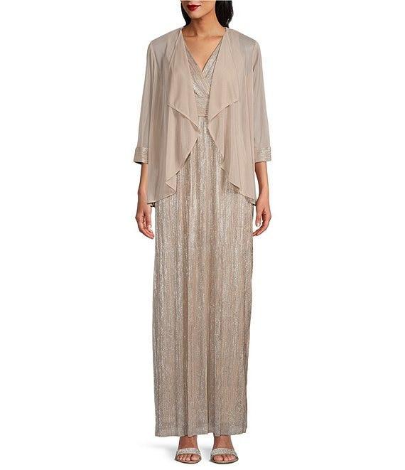 From R & M Richards, this jacket dress features: Jacket: metallic jacquard knit fabrication 3/4 sleeves open front neckline approx. 32" length nylon/metallic/polyester/spandex hand wash/dry flat Dress: metallic jacquard knit fabrication shift silhouette round neckline sleeveless lined center back zip closure approx. 39.5" length nylon/metallic/polyester/spandex hand wash/dry flat Imported.