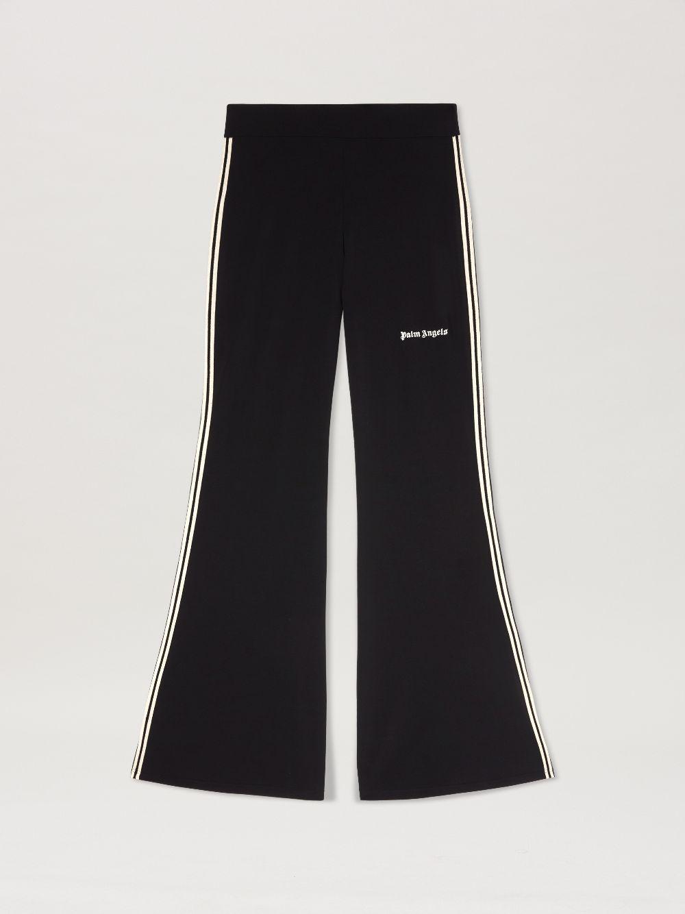 High-waisted pants with elastic waistband. Flared hem. Contrasting side stripes, text and numbers on front.